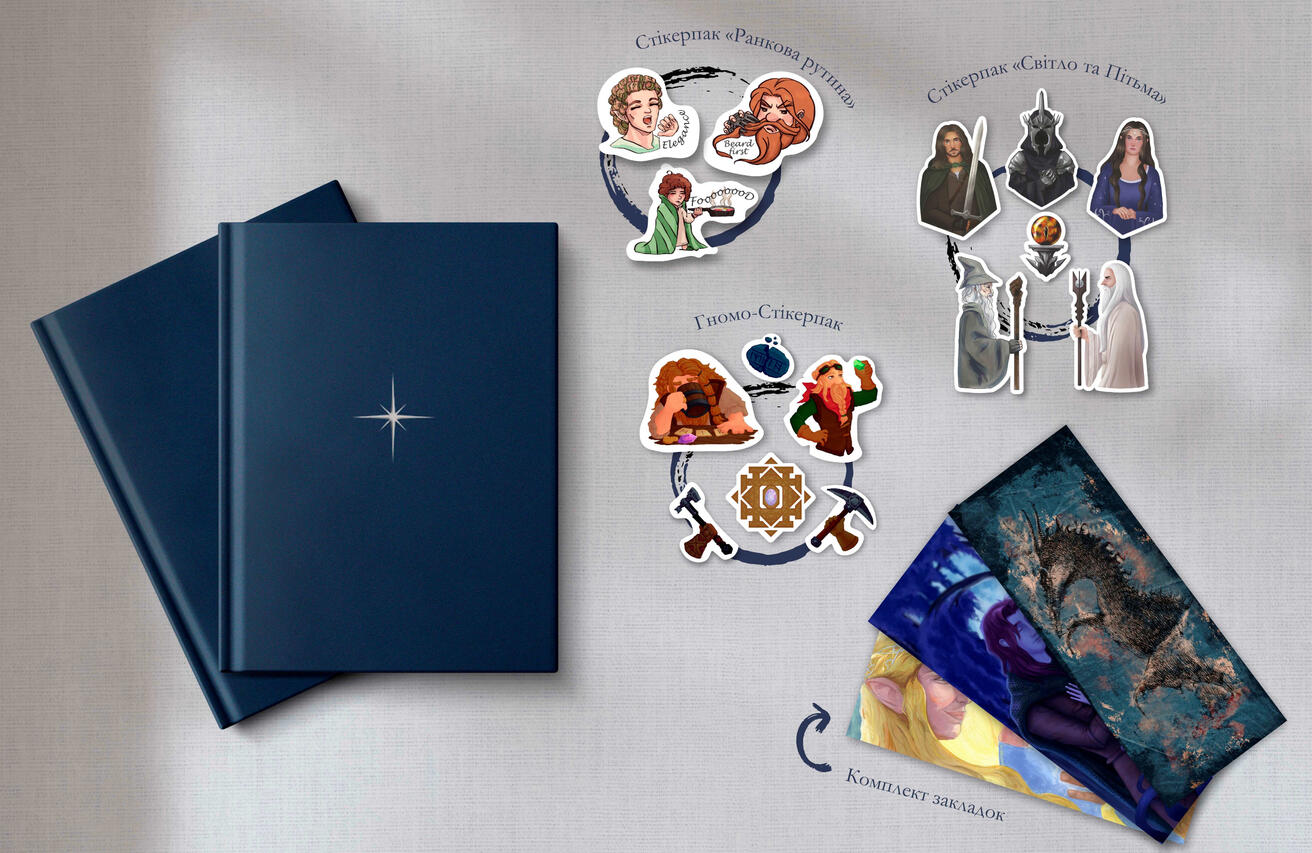 "Гобітська торбинка" - окрім примірника арт-збірника, в цей набір входив комплект мерчу, що складався з: